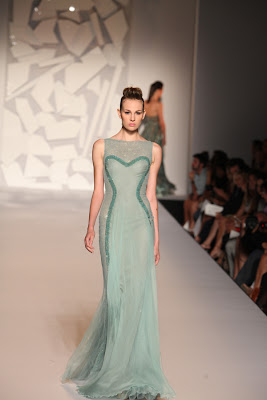 Lo stilista Abed Mahfouz, presenta la collezione Couture per l'Autunno-Inverno 2012-2013 durante la settimana di AltaRoma AltaModa. L'arte di Abed Mahfouz, si conferma ancora una volta nell'alta moda internazionale, come il Ponte tra l'oriente & l'occidente. Abed Mahfouz ispirandosi alle stampe Barocche presenterà una collezione intitolata “Contemporary Baroque”. La collezione Couture ideata da Abed Mahfouz evoca il lusso con i suoi disegni eleganti pieni di dettagli sorprendenti. I colori sono innovativi e le stampe uniche. I motivi barocchi ripresi dalle tappezzerie di castelli e palazzi d'epoca, sono riprodotti con pietre e cristalli sparsi sugli abiti tinta su tinta con effetto contemporaneo. Si susseguono in passerella abiti da cocktail e abiti da sera arricchiti oltre che da paillette di varie misure e forme, da piume di struzzo, tulle e pizzi delicati che accentuano l'effetto barocco in chiave moderna. Alcuni abiti sono ricoperti da mantelle fluttuanti. Mussola, tulle e organza sono le stoffe dominanti e la loro morbidezza fluttua intorno alle forme femminili creando una figura principesca e sofisticata. Una collezione creata per la donna contemporanea e seducente. Novità e filo conduttore della collezione di Abed Mahfouz sono le nuvole passeggere create con fiori di organza tagliati al laser, raccolti e applicati in modo casuale sugli abiti. Fiori che evocano una sensazione di glamour e di femminilità. Altro accessorio ricorrente nella collezione sono le cinture sottili e strette, altro dettaglio sono le “anche imbottite”, il tutto per accentuare le forme femminile e dare l'illusione della vita da vespa. Possiamo ammirare i tagli a sirena tanto cari allo stilista, con effetto godet sotto il ginocchio. I colori della collezione s'ispirano ai colori della natura e della terra. Una palette con diverse tonalità che vanno dal beige chiaro al fango, il pesca, il bois de rose, il viola ghiaccio, il frosty green, il prerie sunset, il griggio, l'argente e l'oro. Infine, l'unione dei disegni barocchi con effetto contemporaneo si materializza nell'abito da sposa off-white arricchito con cristalli applicati dall'effetto esuberante.